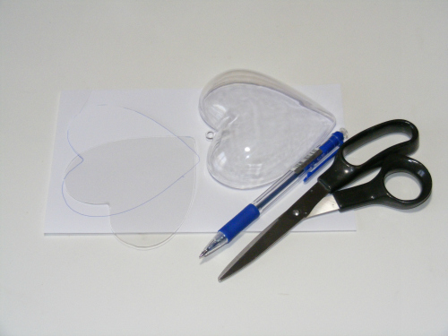 Az átlátszó műanyag szívet és a keményebb karton vagy műanyag lapot készítsük elő. A szívecskénk egyik felét először sablonként fogjuk használni, mivel ennél a szívnél nincs belső elválasztó elem. (Ha sikerül beszerezni olyat, amiben van elválasztó elem, úgy ez a lépés kihagyható.) Én egy keményebb műanyag lapot használtam, de a célnak megfelel egy kartonlap is.