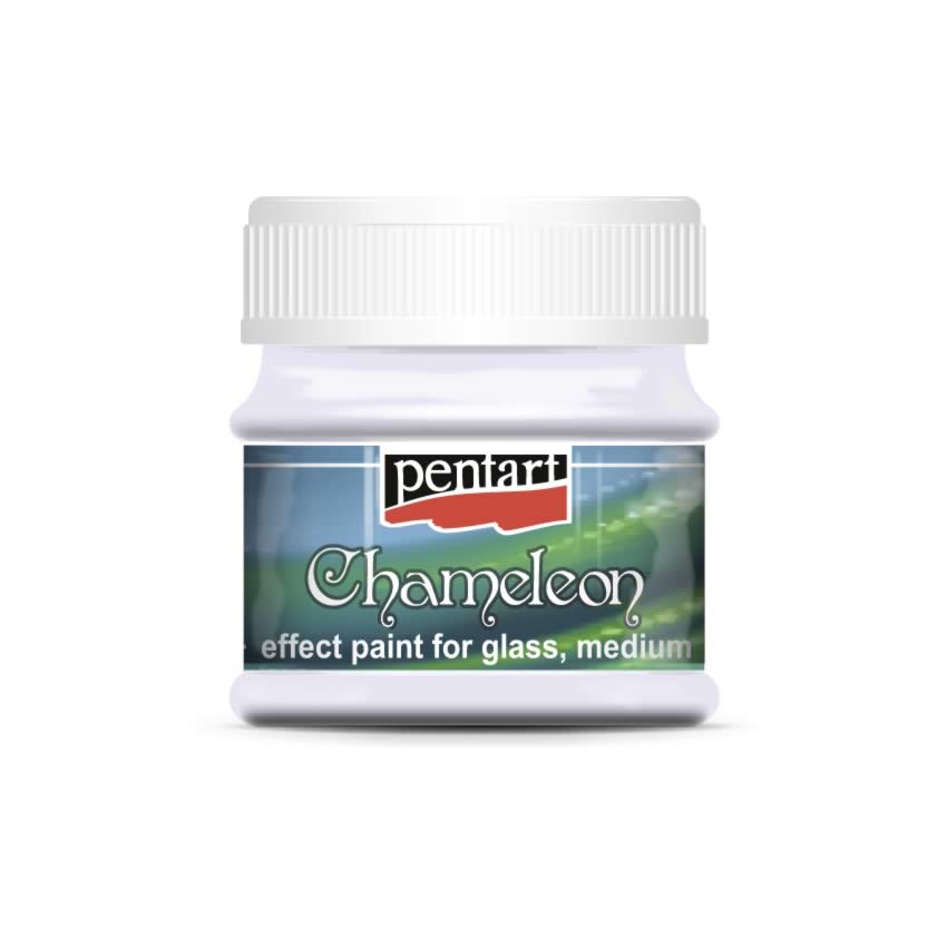 Chameleon üvegfesték – Vízbázisú, irizáló, színjátszó hatású, áttetszőre száradó festék üvegre. Használjuk ecsettel vagy szivacsecsettel. A hatás leginkább ívelt vagy strukturált felületeken érvényesül. Ne égessük ki!