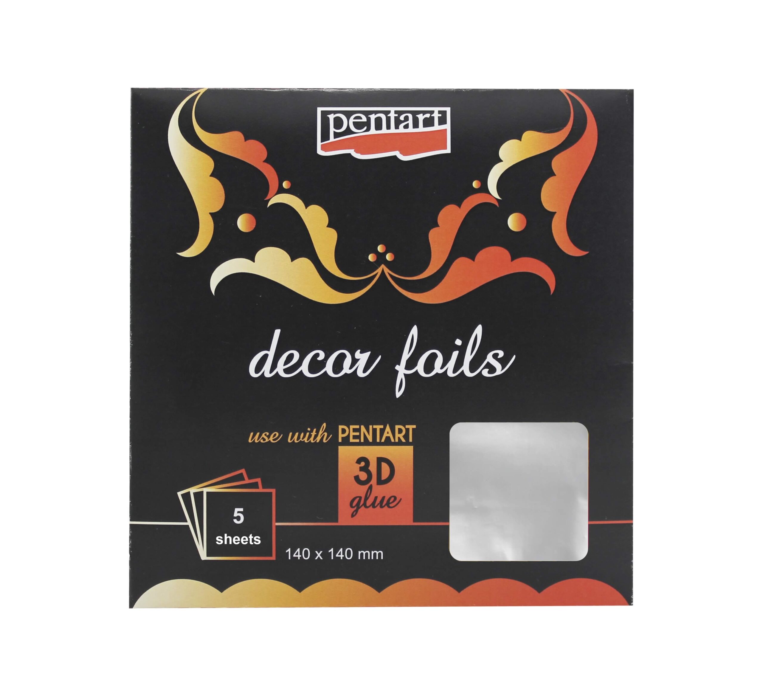 Dekorfólia – Metál vagy hologramos hatású lapok különleges felületek létrehozásához. A csomag 5 db 14 x 14 cm-es lapot tartalmaz. Használjuk Pentart 3D ragasztóval, majd vízbázisú, fényes lakkal védjük a felületet. Javasoljuk a Pouring lakk használatát, ami kiemeli a fóliák színét. Metál, színes metál és hologramos változatban kapható.