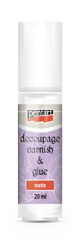 Dekupázs ragasztólakk matt – Vízbázisú ragasztó és lakk egyben dekupázs technikához. Mattra szárad. Könnyen és egyenletesen kenhető. Használjuk rizspapír vagy szalvéta alá, valamint fölé is. A normál papírt áztassuk vízbe a felragasztás előtt. A ragasztólakkot mindigközépről a szélek felé haladva oszlassuk el a papír tetején, így eltávolíthatjuk a légbuborékokat.