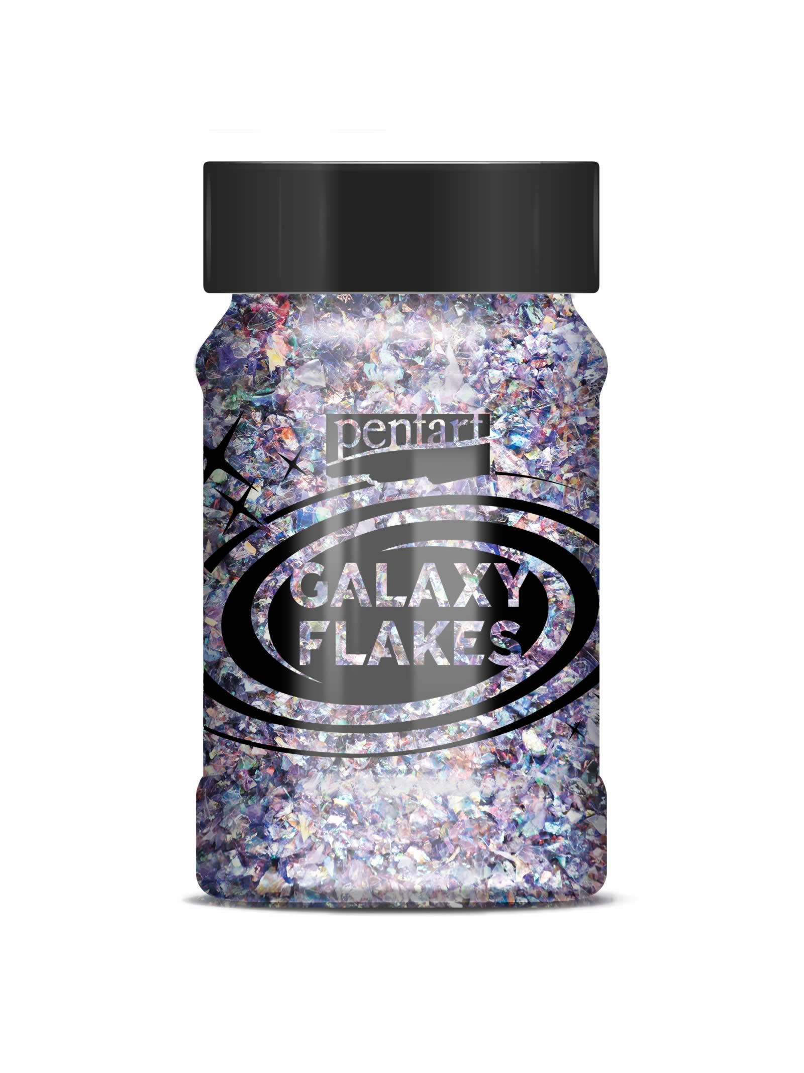 Galaxy Flakes – Irizáló, szabálytalan alakú pelyhek. Használhatjuk az öntapadóra száradó hobbiragasztóval, vagy belekeverhetjük átlátszó gélekbe és lakkokba. A hatás világos és sötét felületeken eltérő.